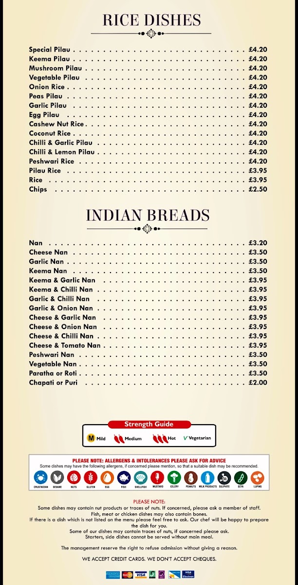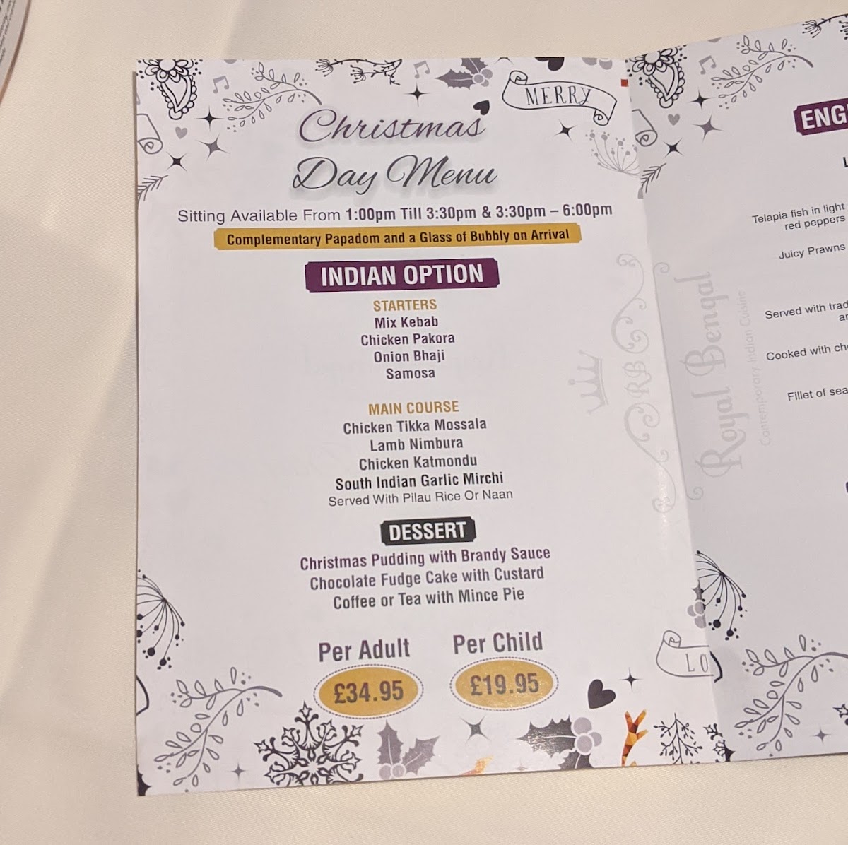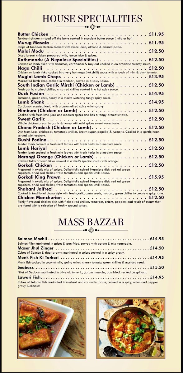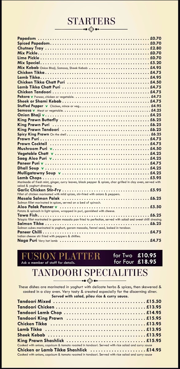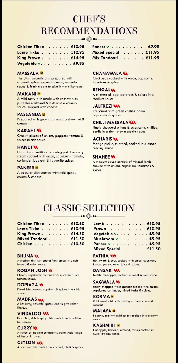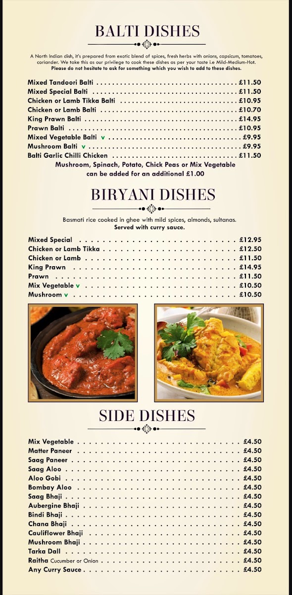 The menu at Royal Bengal offers a delightful range of dishes, blending traditional Indian flavors with specialty options to suit all tastes. Start your meal with crispy Chicken Pakora or Onion Bhaji, both of which bring a satisfying crunch. For the main course, the Chicken Tikka Masala and Lamb Nimbura are both hearty choices, alongside the exotic Chicken Katmondu and the fiery South Indian Garlic Mirchi. The Tandoori Specialities section shines with choices like Tandoori Chicken, Tandoori Lamb Chop, and Tandoori King Prawn, perfect for those seeking a smoky, grilled taste. The Chef's Recommendations, including the rich Makani and flavorful Handi, offer an elevated experience for those looking to try something unique. If you're craving something classic, the Bhuna, Rogan Josh, and Vindaloo are staples. The Balti Dishes feature a range of options, from the Mixed Tandoori Balti to the King Prawn Balti, while the Biryani Dishes provide a fragrant, spiced rice base with selections like Mixed Special and Chicken Tikka. For side dishes, the Saag Paneer and Aloo Gobi provide comforting accompaniments, and for dessert, the indulgent Chocolate Fudge Cake with Custard and Christmas Pudding with Brandy Sauce round out the meal. Don’t forget to try a refreshing Virgin Colada or Bombay Sunrise from their non-alcoholic cocktail selection. With its extensive menu, Royal Bengal delivers a satisfying and diverse dining experience for every palate.